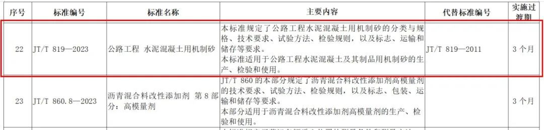 近日,交通運(yùn)輸部發(fā)布29項交通運(yùn)輸行業(yè)標(biāo)準(zhǔn)的公告,其中有標(biāo)準(zhǔn)編號為JT/T 819—2023的《公路工程水泥混凝土用機(jī)制砂》。這標(biāo)志著,在我國公路工程領(lǐng)域,水泥混凝土用機(jī)制砂正式有了新的行業(yè)標(biāo)準(zhǔn),這將大大促進(jìn)機(jī)制砂在該領(lǐng)域的推廣應(yīng)用。